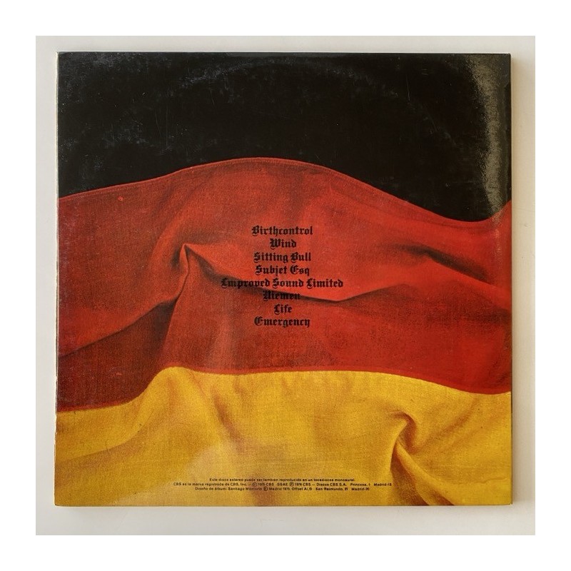 Unique Spanish picture cover ( made with a Spanish flag over a black wall) and great krautrock double album compilation featuring tracks from Birth Control, Wind, Sitting Bull, Subject Esq., Improved sound limited, Niemen, Life and Emergency.... First pressing, orange labels, laminated gatefold, original hype sticker…. Highly Recommended!