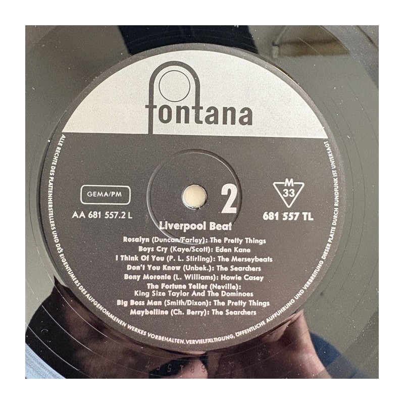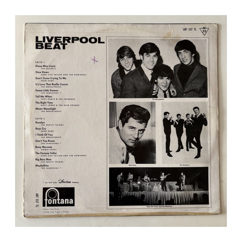 German only Rock & Roll Beat rare Compilation ( Pretty Things, Escorts, Searchers, Merseybeats, Davy Jones….1st German pressing Strong VG+ front laminated cover neatly taped at bottom hardly noticeable, record plays EX, very clean