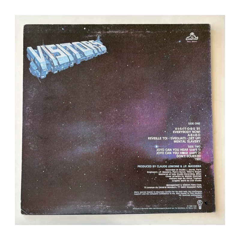 Italian French Cosmic Disco Synth Pop rock… produced by JP Massiera.. Italian 1st pressing ..Faint rw, punch hole, so downgraded, M- record with inner