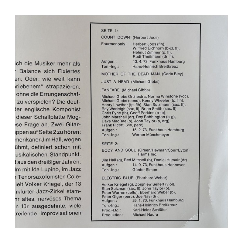 German radio promo only album series, very rare ( not in Discogs already!) ….with Michael Gibbs, Herbert Joos, Carla Bley, Daniel Humair, Eberhard Weber…. Top Archive ( probably unplayed) condition
